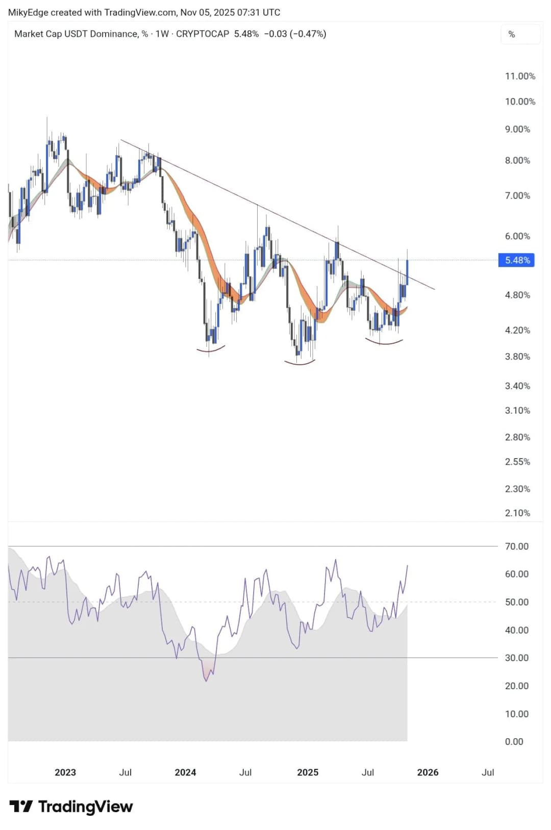 «بازار نزولی تایید شد»، تحلیلگر Mikybull Crypto در یک پست چهارشنبه در X نوشت و به بریک اوت تسلط بازار USDT از یک الگوی سر و شانه معکوس در تایم فریم هفتگی اشاره کرد. او در پست بعدی نوشت: «الگویی مشابه در چرخه های قبلی به بازار نزولی منجر شده بود.»
