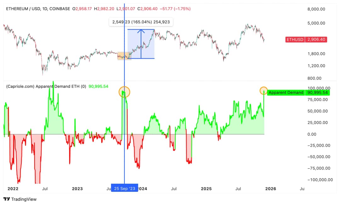 متریک Apparent Demand که توسط Capriole Investment ارائه شده نشان می دهد تقاضا برای اتر به شدت افزایش یافته و از 37,990 ETH در 22 نوامبر به 90,995 ETH در 26 نوامبر رسیده است. افزایش تقاضای ETH در زمان ریزش قیمت نشان دهنده انباشت تهاجمی در اصلاح های قیمتی است و به یک بازگشت قیمت قریب الوقوع اشاره دارد.