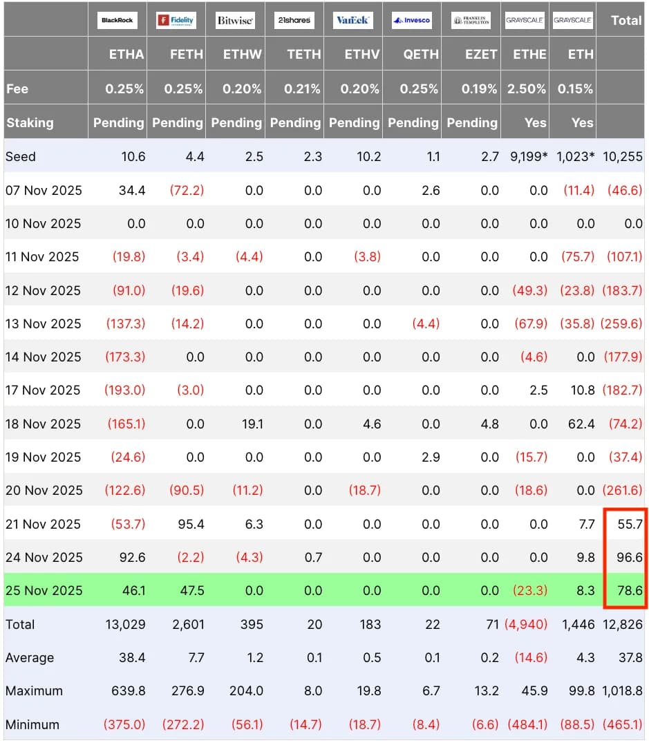 در همین حال، جریان های ETF اسپات اتریوم مثبت شده اند و برای سه روز متوالی ورود سرمایه ثبت کرده اند که مجموعاً 230.9 میلیون دلار را تشکیل می دهد. این بازگشت پس از یک دوره سنگین از 11 تا 20 نوامبر رخ داد که در آن صندوق های اتریوم مجموعاً 1.28 میلیارد دلار افت داشتند، یکی از طولانی ترین و عمیق ترین موج های منفی از زمان راه اندازی ETFها بود.