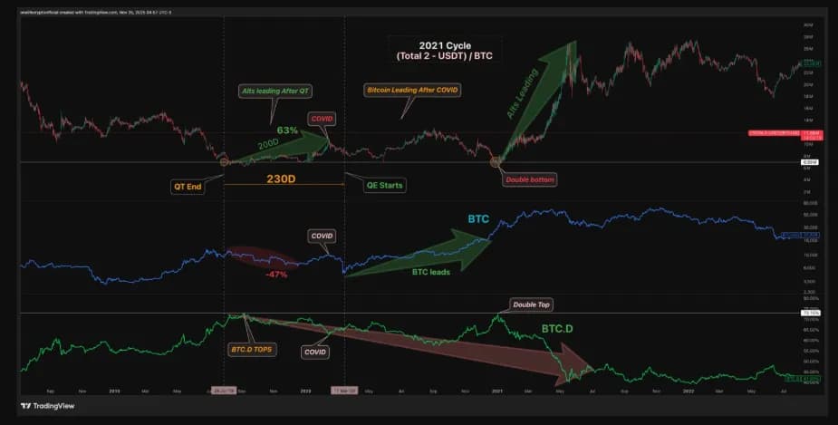 اگر تاریخ تکرار شود، پایان QT یک چرخش نقدینگی را شعله ور خواهد کرد که می تواند آلتکوین ها را به رهبری ETH در ماه های آینده از BTC پیش بیاندازد.