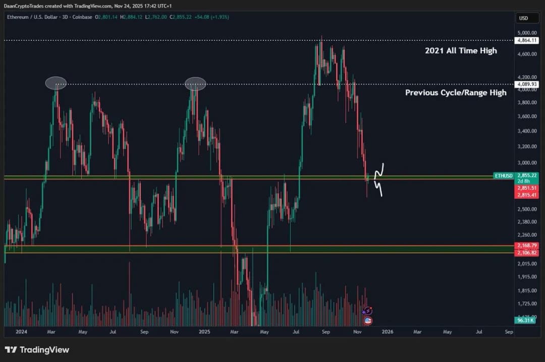 تحلیلگران می گویند ETH باید این حمایت 2,800 دلاری را حفظ کند تا گاوها بتوانند جای پا بگیرند. «اتریوم دوباره در سطح بزرگ 2.8K معامله می شود که در طول این چرخه همواره به عنوان یک حمایت و مقاومت قوی عمل کرده است»، Daan Crypto Trades در پستی در X در روز دوشنبه نوشت و افزود: «حیاتی است که گاوها این ناحیه را دفاع کنند.»